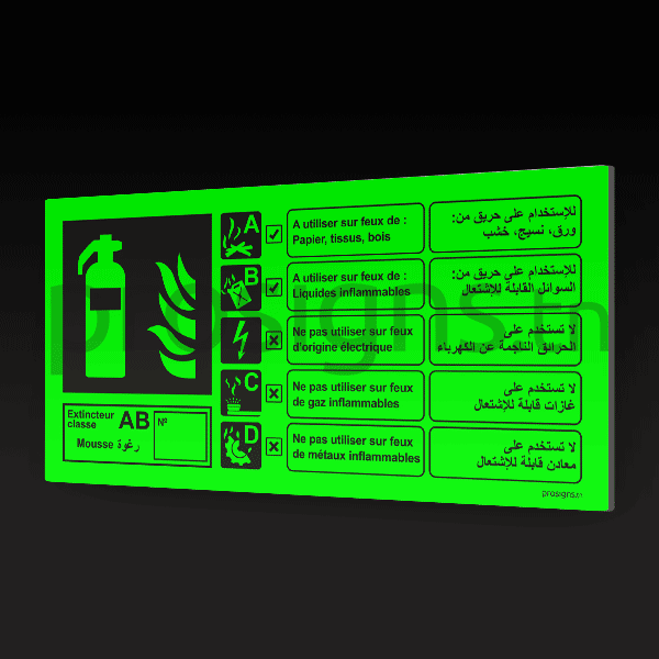 Plaque / Panneau drapeau Photoluminescent / Phosphorescent ‘Glow-in-the-dark’. HNFEX052PL - Extincteur classe A-B, mousse. En Arabe et Français