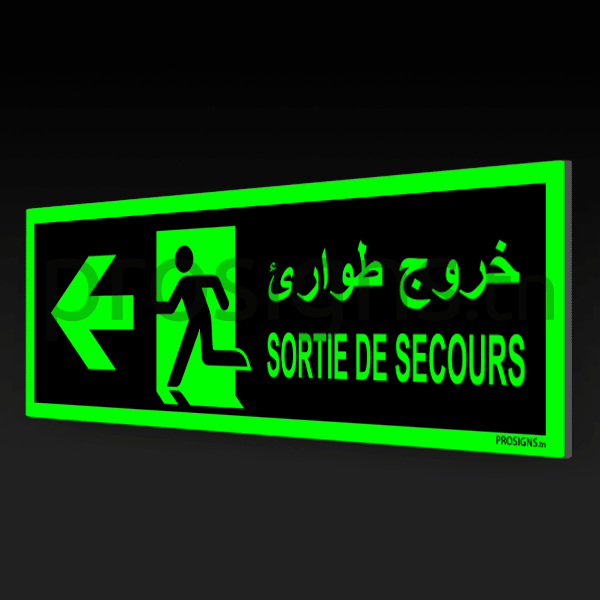 Plaque / Panneau suspendu Photoluminescent / Phosphorescent. PLA270/E001mar - Sortie de secours (gauche) خروج طوارئ