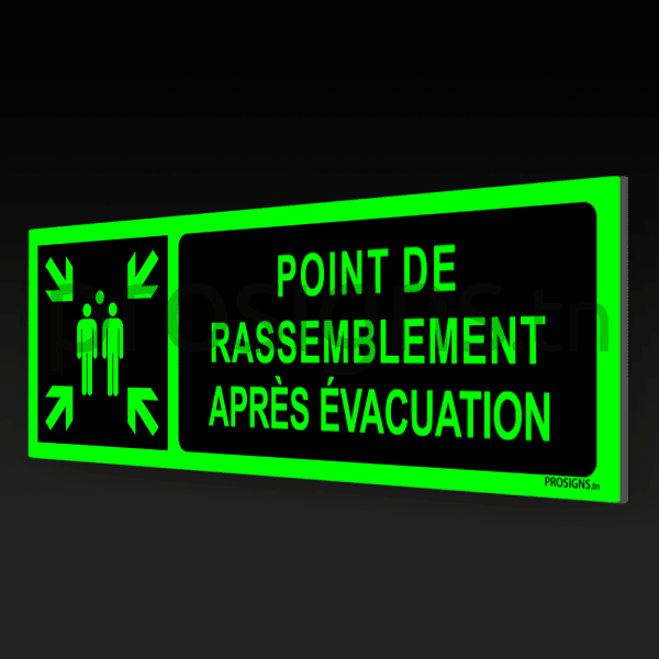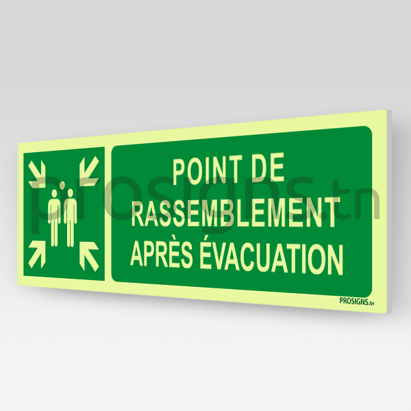 Panneau Photoluminescent / Phosphorescent / ‘Glow-in-the-dark’. PLE007mar – Point de rassemblement après évacuation نقطة تجمع بعد الإخلاء