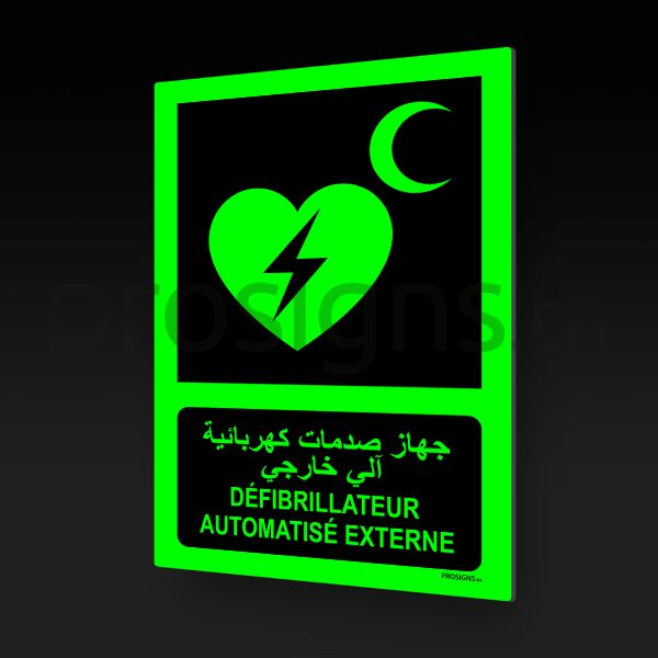 Plaque / Panneau drapeau Photoluminescent / Phosphorescent (En Arabe et Français). PD-PL-E010mar - Défibrillateur automatisé externe جهاز صدمات كهربائية آلي خارجي