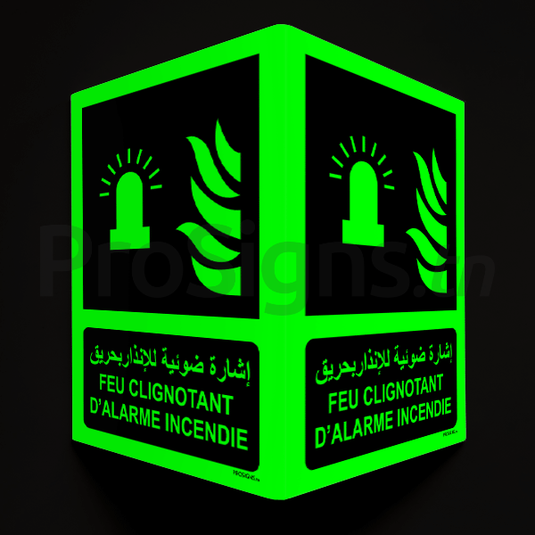 Plaque / Panneau drapeau Photoluminescent / Phosphorescent (En Arabe et Français). PD-PL-F018mar - Feu clignotant d’alarme incendie إشارة ضوئية للإنذار بحريق