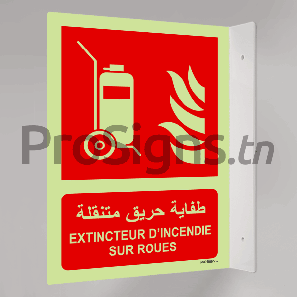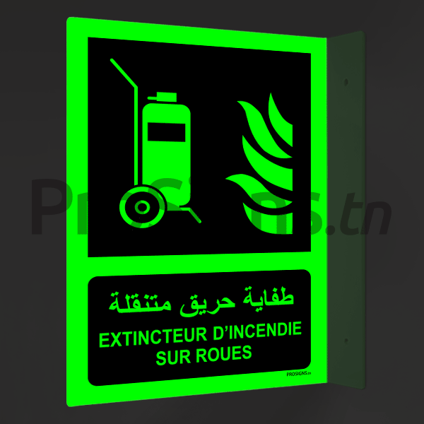 Plaque / Panneau angulaire 3D Photoluminescent / Phosphorescent (En Arabe et Français). PA-PL-F009mar - Extincteur d’incendie sur roues طفاية حريق متنقلة
